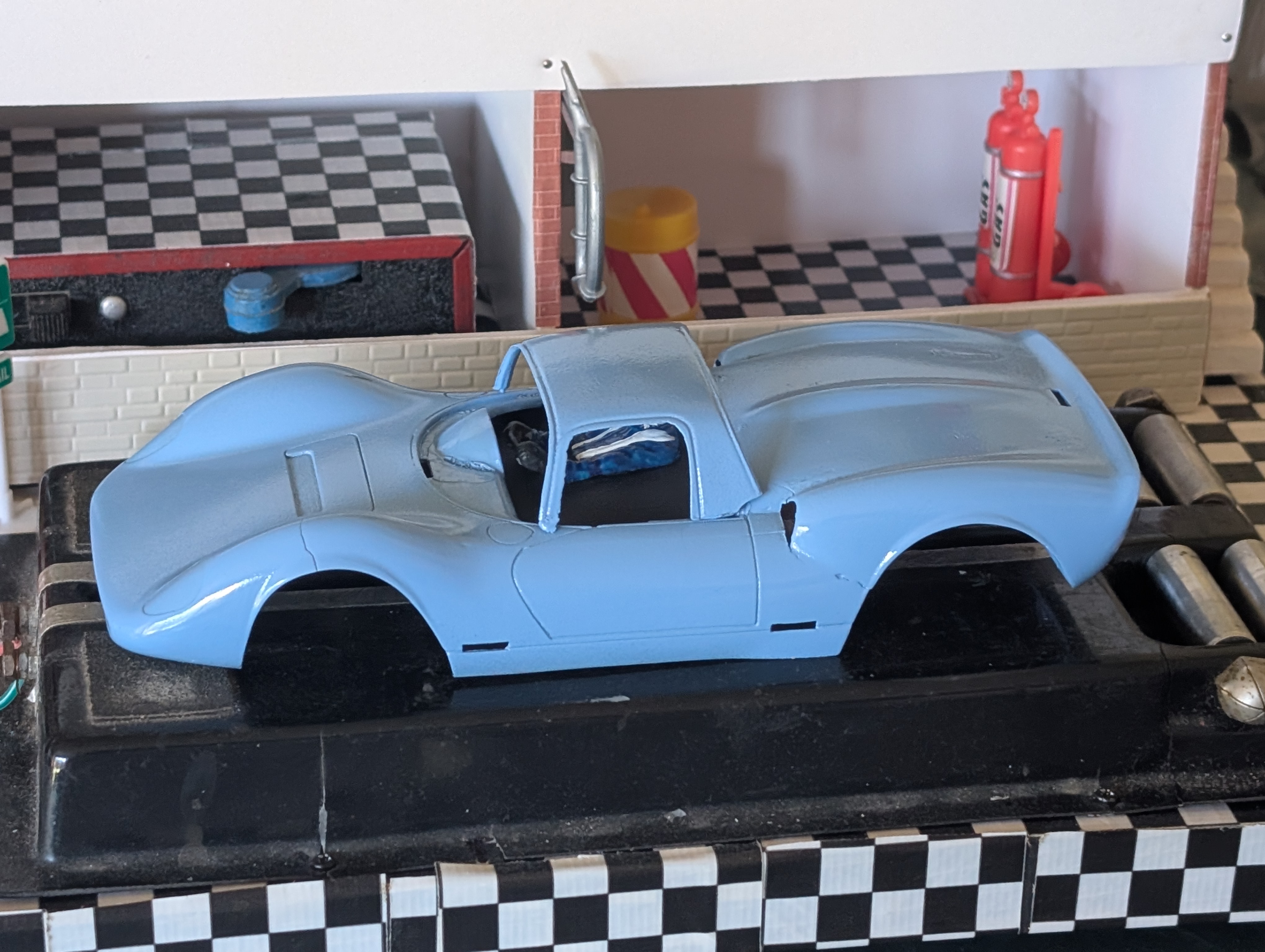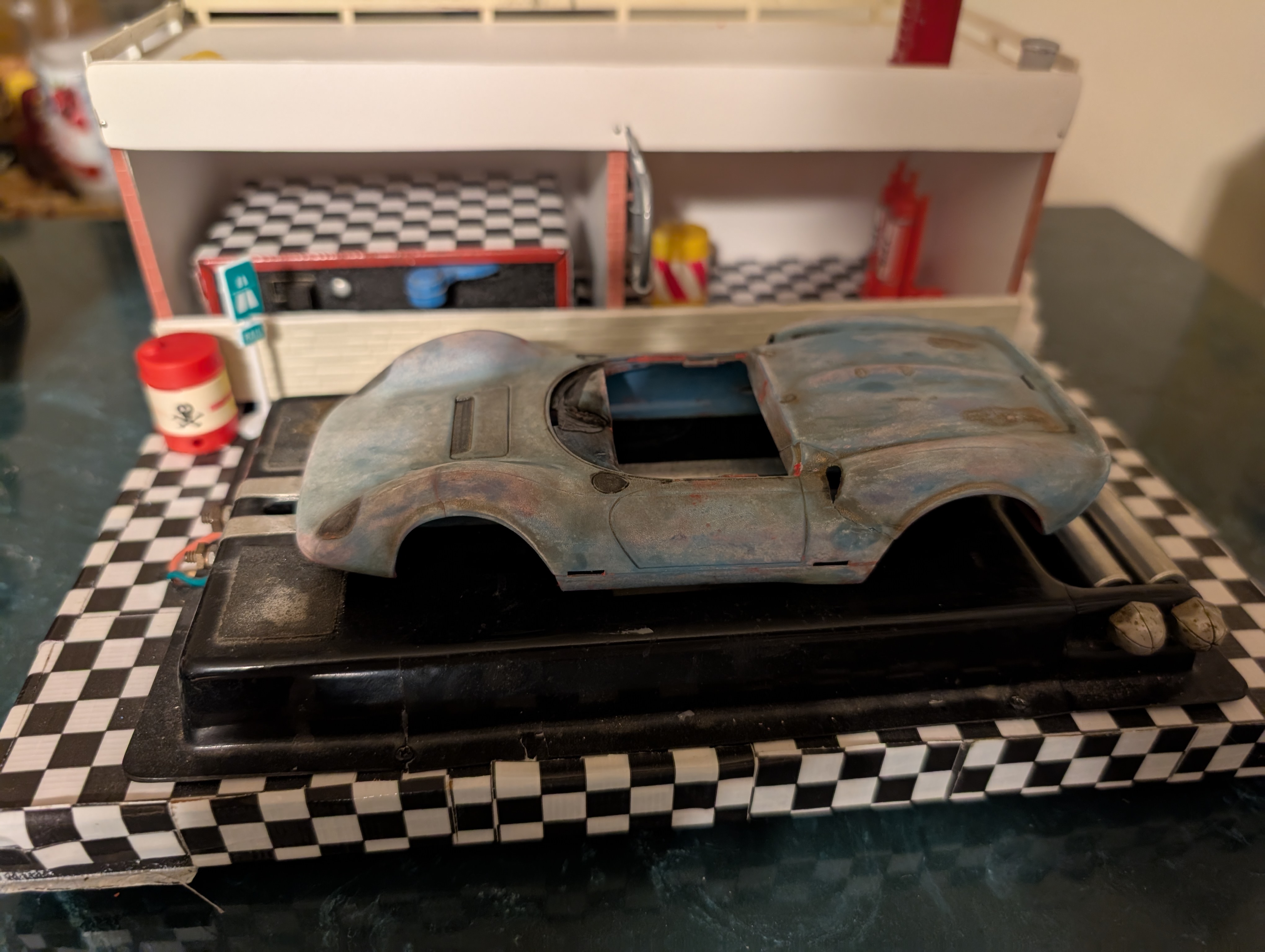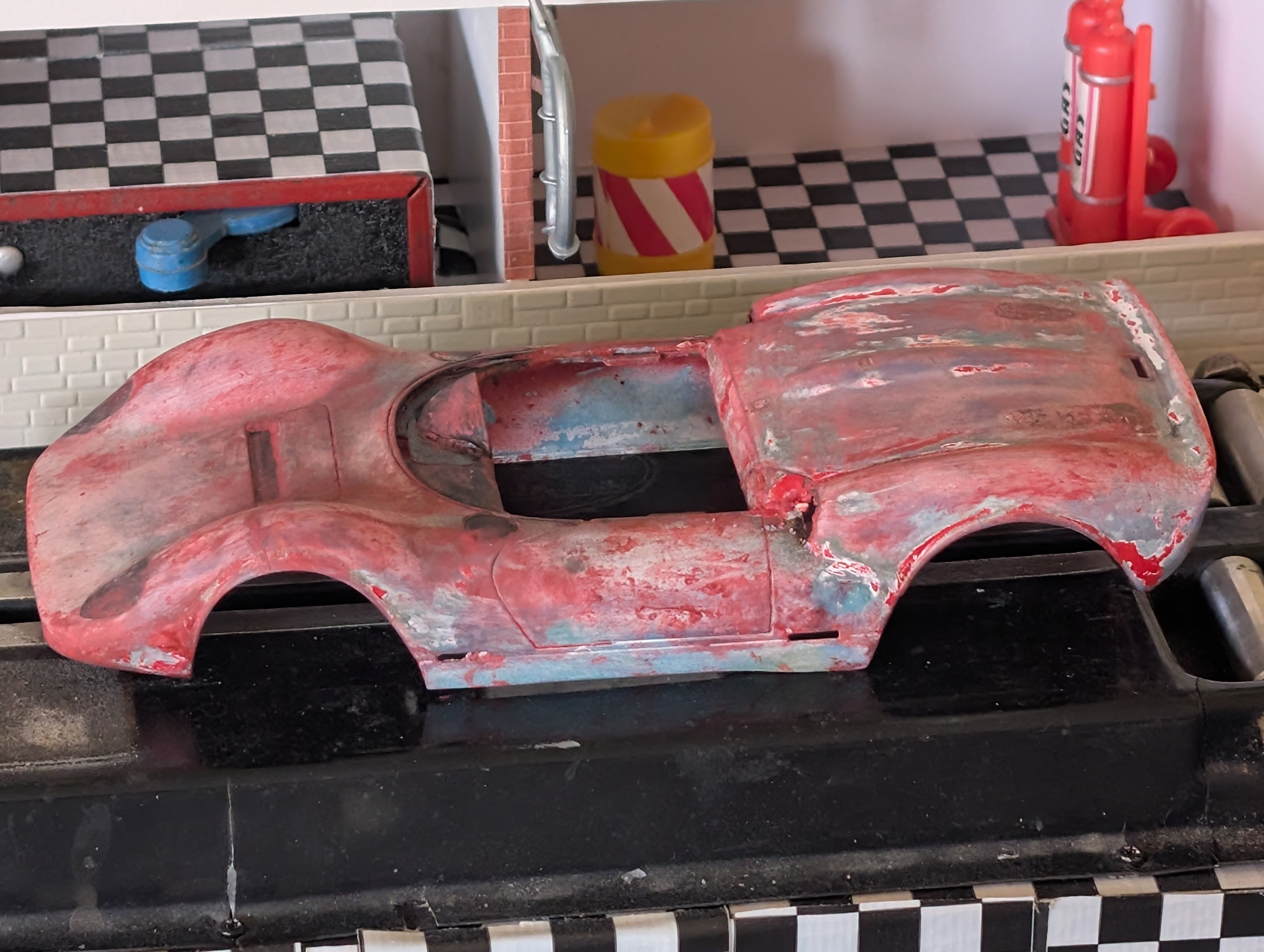 It was painted red. When beginning to remove old paint, it was revealed the original color to be the rarer blue one.
