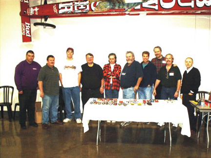 The drivers posing for a family picture. From left to right: Dennis Hill (Sonic Products), Chris Radisich (Uncle Kal's) Mike Nelson (Buena Park Raceway), Mike Boemker, Luiz-Claudio Valdetaro, Mike Brannian (Sonic Products), Rod McPherson, Jim Cunningham (both also entrants), Paul Sterrett, and Chief-Honcho-Diktatooor-El Jefe Philippe de Lespinay. |