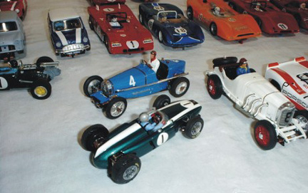The modified red and yellow GB-Track Porsche 917PA which set pole position was Bryan Warmack's entry and followed exactly the design of Kathryn Walwick's successful Porsche 908. Unfortunately, it broke its guide during the race, depriving it from a possible win. The black car is Luiz Valdetaro's "Bentley", sleek but not so scale... It had a wood chassis that was quite efficient, but used thin braided contacts that did not work well. The Porsche 962 was a combined Russell Sheldon/Rod McPherson entry, and did well until its motor over-heated. |