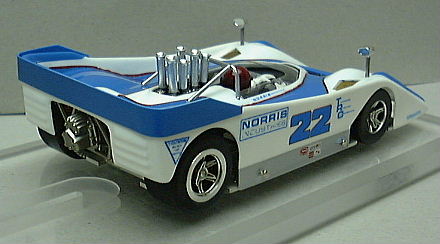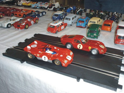 Lucio Cocchi's splendid Ferrari 312P, made in collaboration with his club in Italy, was seriously handicapped by its stock FLY tires. Regardless, it behaved nicely if lacking grip to contest for a top spot. Behind it is Al Penrose's (BWA Minispeed) 37 year-old Revell stock Ferrari 250GTO which showed the way to most entries. It handled great, its Pittman motor was fast, and it was a pleasure to drive. The Ortmann tires were the only change from original configuration. |