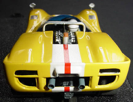 Matthieu Visser's McLaren M6A was as perfect as one would want for an actual working 1/32 scale car. Besides, it was FAST and very reliable to a fault, even after it lost a rear wheel! Soldiering on three, it achieved a second-place finish and handily won the Concours. Its chassis was a laser-cut angle-winder with a Professor Motor mill, not the fastest by all means but the most consistent. The whole car was finely detailed, far from the rough previous attempts submitted by Matt. A sure winner, and it was. It suffered absolutely no racing damage during its race to the overall win. It also cleared the .125" ground clearance with room to spare. |