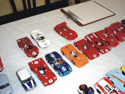 Lucio Cocchi's splendid Ferrari 312P, made in collaboration with his club in Italy, was seriously handicapped by its stock FLY tires. Regardless, it behaved nicely if lacking grip to contest for a top spot. Behind it is Al Penrose's (BWA Minispeed) 37 year-old Revell stock Ferrari 250GTO which showed the way to most entries. It handled great, its Pittman motor was fast, and it was a pleasure to drive. The Ortmann tires were the only change from original configuration. |