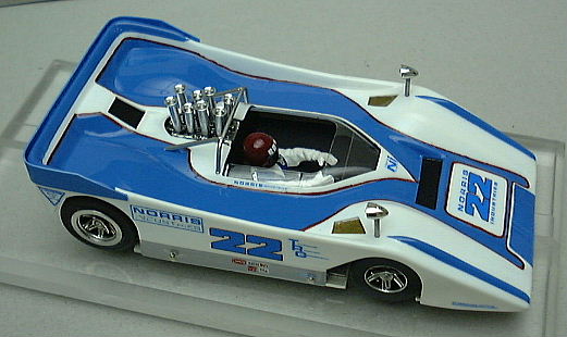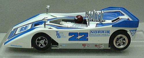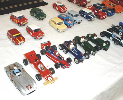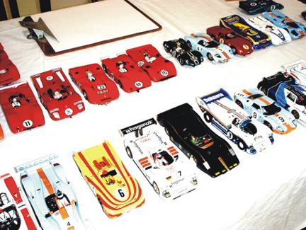 The modified red and yellow GB-Track Porsche 917PA which set pole position was Bryan Warmack's entry and followed exactly the design of Kathryn Walwick's successful Porsche 908. Unfortunately, it broke its guide during the race, depriving it from a possible win. The black car is Luiz Valdetaro's "Bentley", sleek but not so scale... It had a wood chassis that was quite efficient, but used thin braided contacts that did not work well. The Porsche 962 was a combined Russell Sheldon/Rod McPherson entry, and did well until its motor over-heated. |